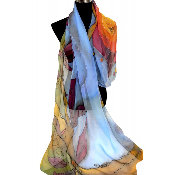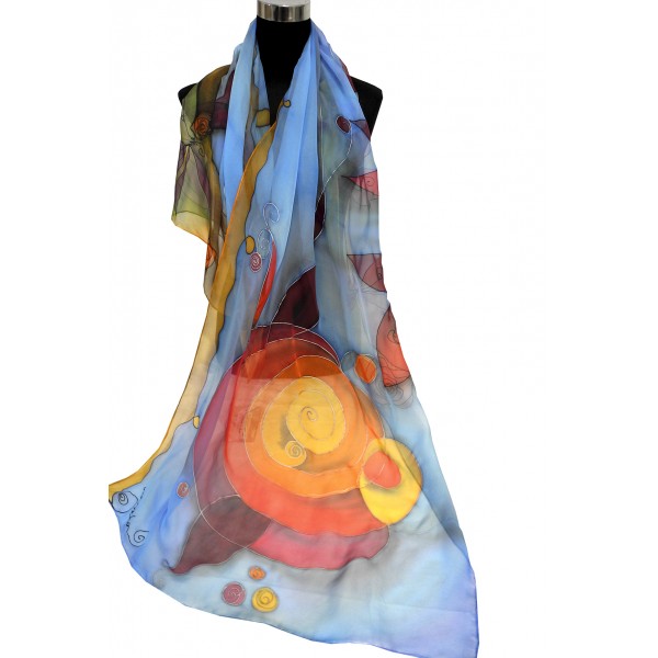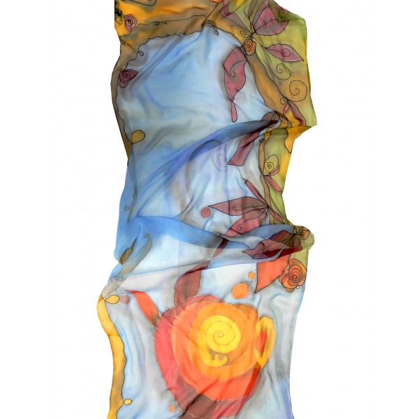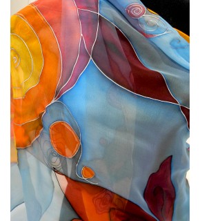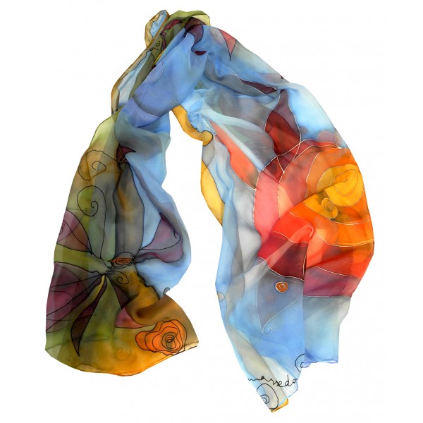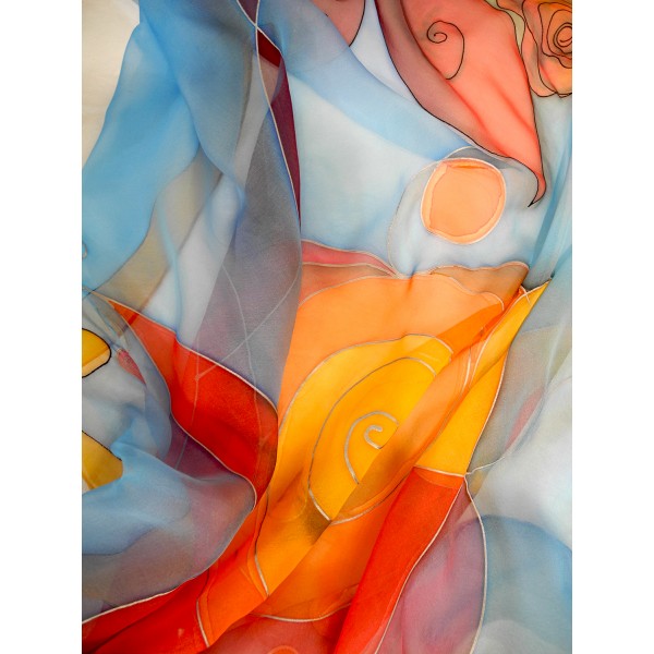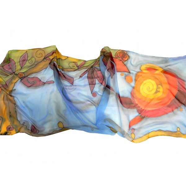 Diseño: Este foulard está decorado con un gran sol perfilado en plata en uno de sus extremos, y un árbol en el otro, creando una composición equilibrada y simbólica. El fondo azul evoca el cielo y sirve de base para una preciosa paleta de colores: amarillos, naranjas, verdes y azules que se funden con armonía. Si textura vaporosa lo convierte en el accesorio perfecto para cualquier estación.