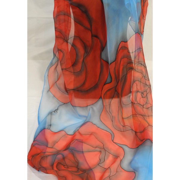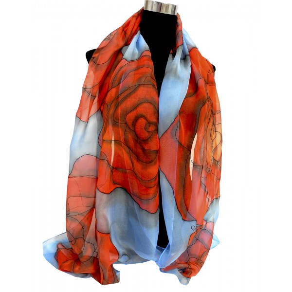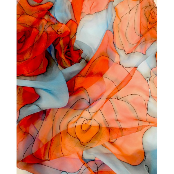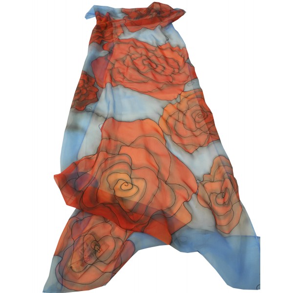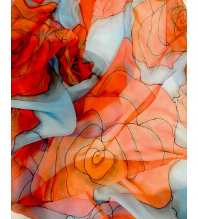 Diseño: Este foulard está decorado con grandes y hermosas rosas rojas que se extienden a lo largo de toda la pieza, creando un diseño luminoso y lleno de vida. El fondo azul cielo aporta serenidad y contraste, haciendo que los tonos rojos resalten con intensidad. Su textura ligera y vaporosa lo convierte en un accesorio versátil, perfecto para cualquier ocasión.