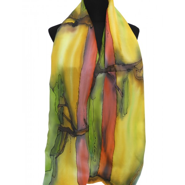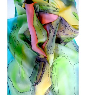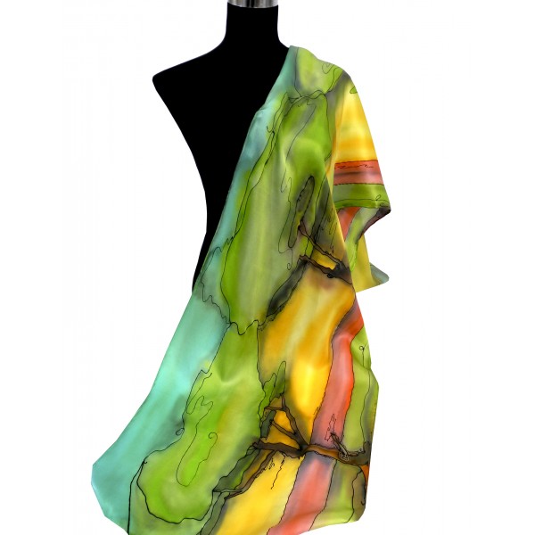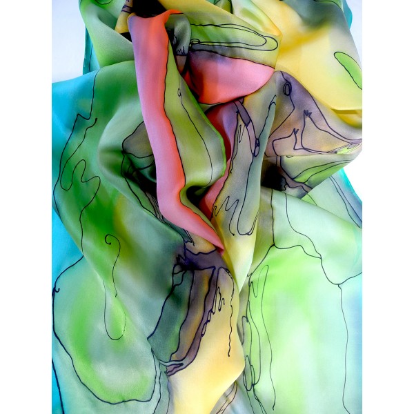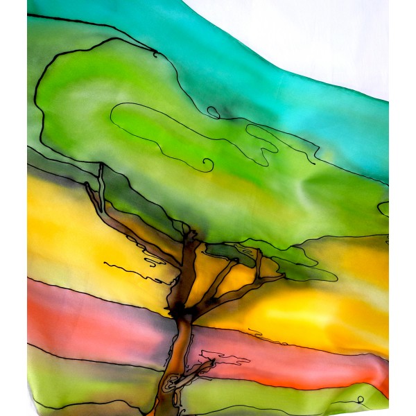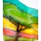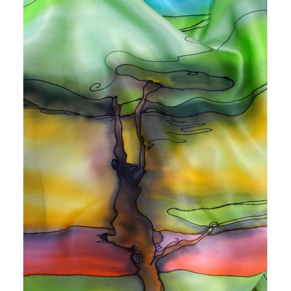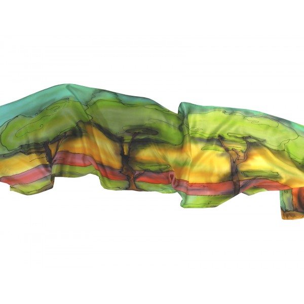 Una pieza artística que captura la magia del atardecer. Este foulard pintado a mano transforma el paisaje en seda, ideal para quienes buscan elegancia con un toque de naturaleza y color
