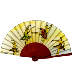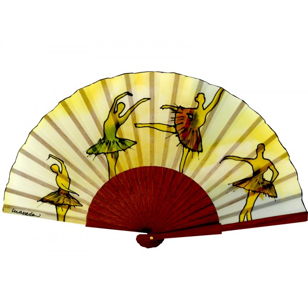 Déjate cautivar por la elegancia de este abanico artesanal de 19 cm, elaborado en madera de abedul y seda natural. Es una pieza única, pintada a mano con esmero y pasión. Sobre un fondo claro con sutiles matices amarillos, cuatro bailarinas clásicas parecen cobrar vida mientras danzan con gracia a lo largo del abanico, creando una escena etérea y poética.