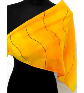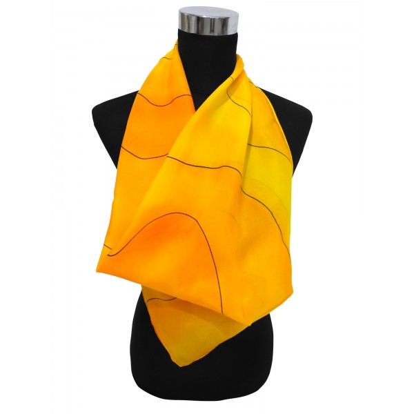 Este pañuelo de 74x74 cm transmite alegría con un color naranja intenso. Su diseño está formado por un fondo en tonalidades naranjas con lineas pintadas en negro que simbolizan ondas. Es un diseño único, ponible en cualquier ocasión, es favorecedor para cualquier look.